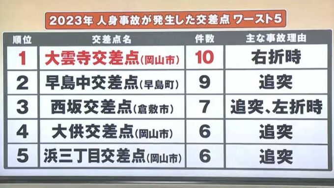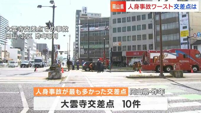 このうち、岡山県内にある交差点で最も多く人身事故が発生したのは、岡山市北区表町3丁目の国道30号「大雲寺交差点」で、車同士の事故や車と歩行者の事故など10件発生したということです。