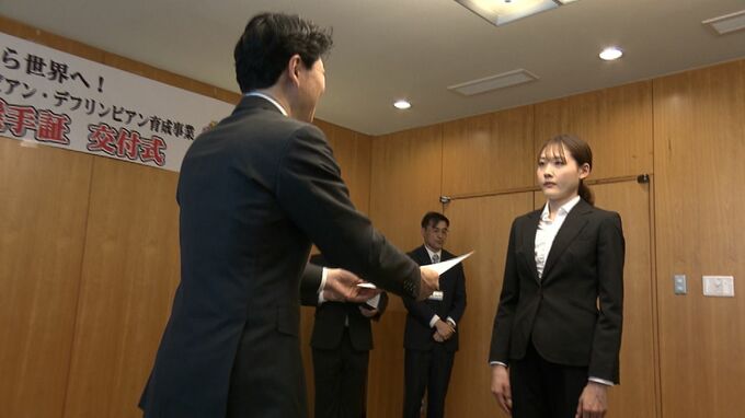 きょう(17日)の交付式では、まず天満屋の前田穂南選手に選手証が手渡されました。前田選手は今年1月大阪国際女子マラソンで日本記録を更新し、パリ五輪出場に内定しました。6月からはアメリカで高地トレーニングを行い大会に備えます。