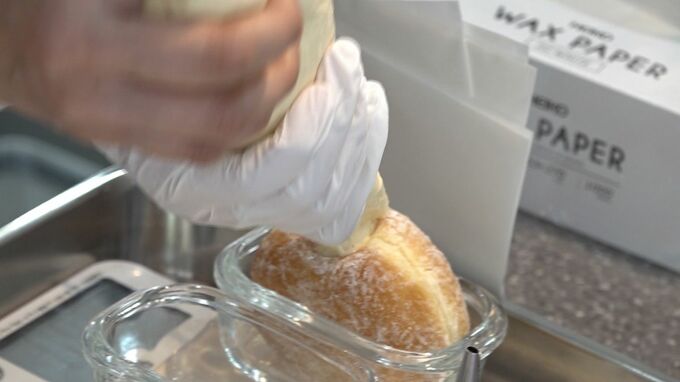 ふわっとして、もっちりした食感を出すために、注文を受けてから桃やレモンなどのオリジナルクリームを入れていきます。店内にはイートインスペースも設けられています。運営するのは軽自動車販売の「くるまのハヤシ」などを運営する株式会社ダブルツリーです。
