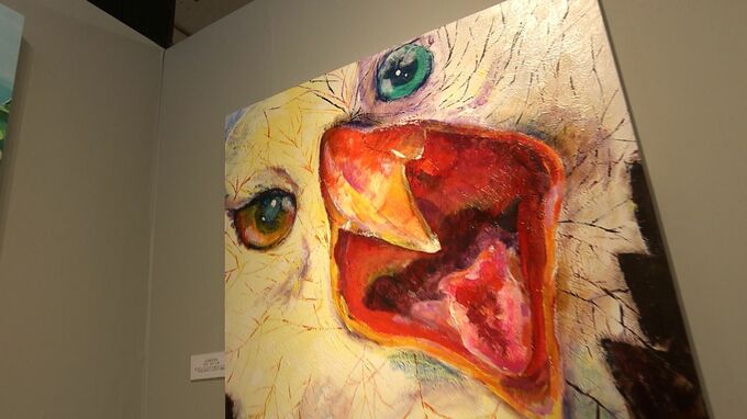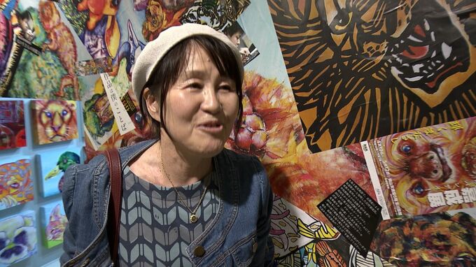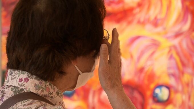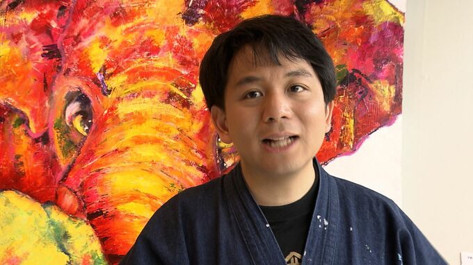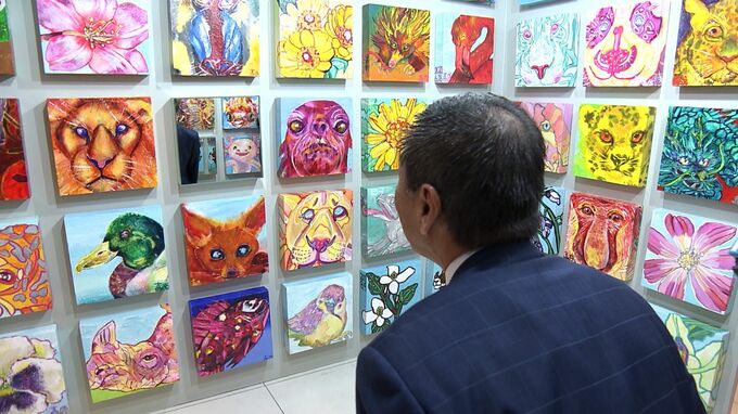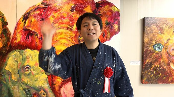 色鮮やかな動物画で知られる自閉症のアーティスト石村嘉成さんの個展「生きものバンザイ!」が岡山市北区で始まりました。