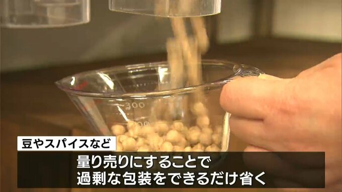 豆やスパイスなどは量り売りにすることで過剰な包装をできるだけ省いています。