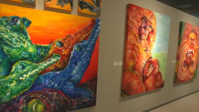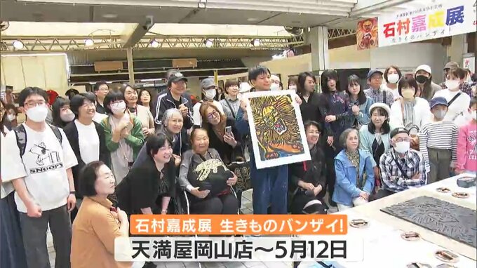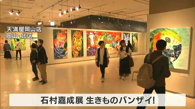 独自の色彩豊かな動物画で注目を集める自閉症の画家・石村嘉成さんの個展が天満屋岡山店で始まりました。最初の週末となったきょう(20日)、多くの来場者で賑わいました。