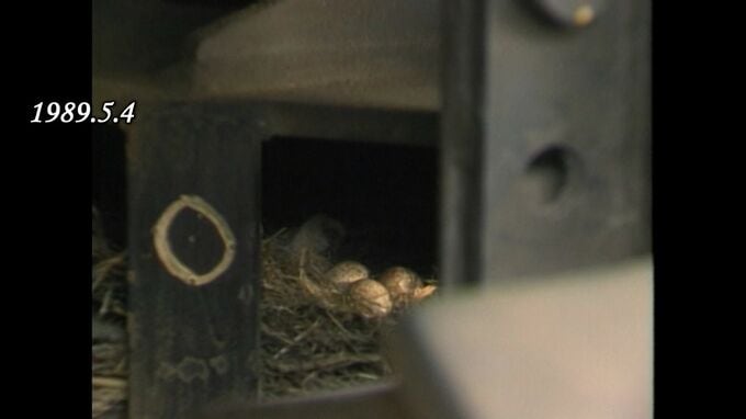 35年前のきょう、上記の「屋根や石垣の隙間」ではなく、まさかの「電気機関車の隙間」に営巣していたセグロセキレイ。