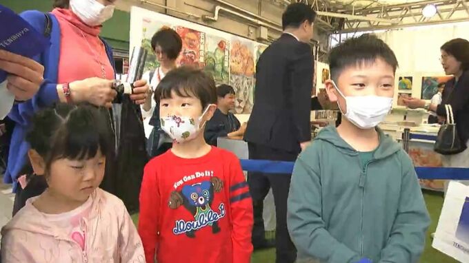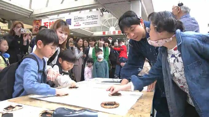 GW初日のきょうは、石村さん親子によるライブドローイングが行われました。訪れた人たちは、石村さんと一緒に版画を制作していきます。