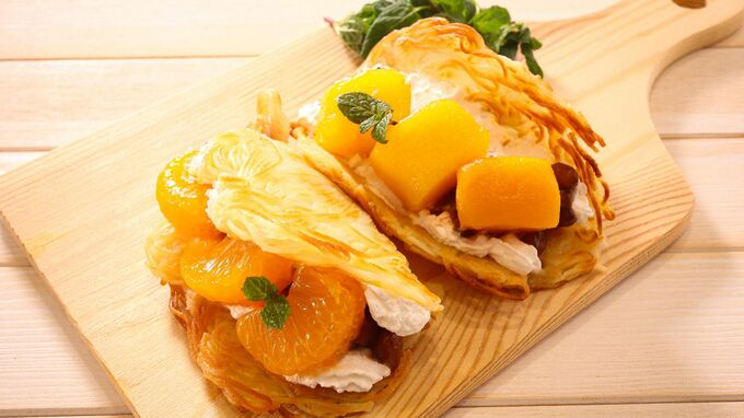 【画像⑤】はその乾麺が進化し過ぎた「『選べるフルーツ』もちッと!そうめんクレープ」です。斬新!