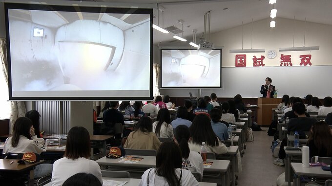 学生たちが最新技術を使った防災研修に取り組みました。岡山市消防団の「学生団員」がバーチャルリアリティの空間で火災現場での消火活動を疑似体験しました。