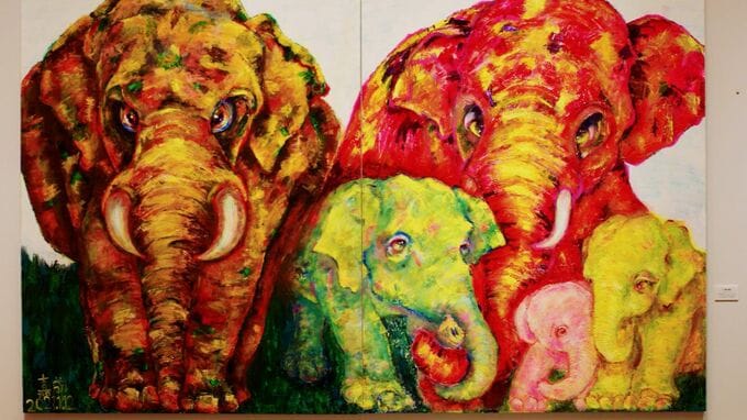 弘光くんの母・奥野充子さんは、自閉症のアーティスト・石村嘉成さんの描いたゾウの親子の絵の前に立ち止まり、その母親ゾウの愛の深さに感動しました。