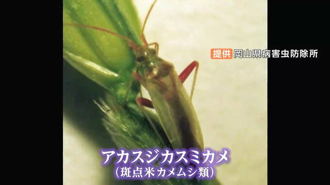 7月、赤磐市と真庭市で行った調査では、「アカスジカスミカメ」がいずれも過去10年間で最も多く確認されたため、5年ぶりに注意報を発表しました。今後さらに増える恐れがあるため、岡山県は生産農家に薬剤の散布など防除の対策の徹底を呼び掛けています。