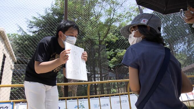 動物のスケッチに来た石村さんに興味津々の女の子がいます。
