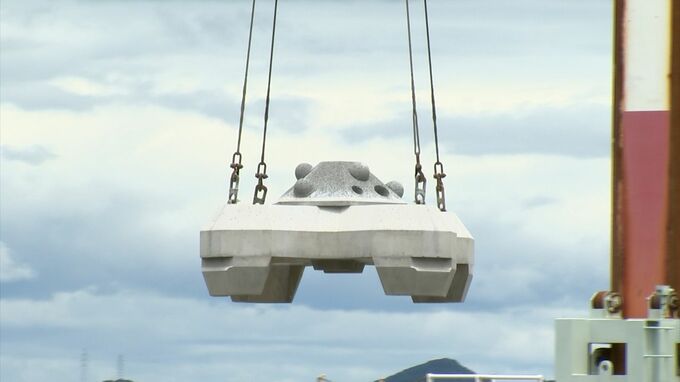 藻の胞子が付着しやすい凹凸があるブロックを、波消し機能がある基礎に乗せた人工魚礁です。藻場の再生について調査・研究に取り組む香川大学が、7基の魚礁を瀬戸内海に設置しました。
