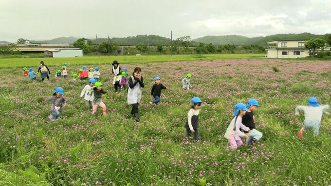 津山市の園児がレンゲ畑で楽しい時間を過ごしました。地元の養蜂家が主催する「れんげパーティー」です。