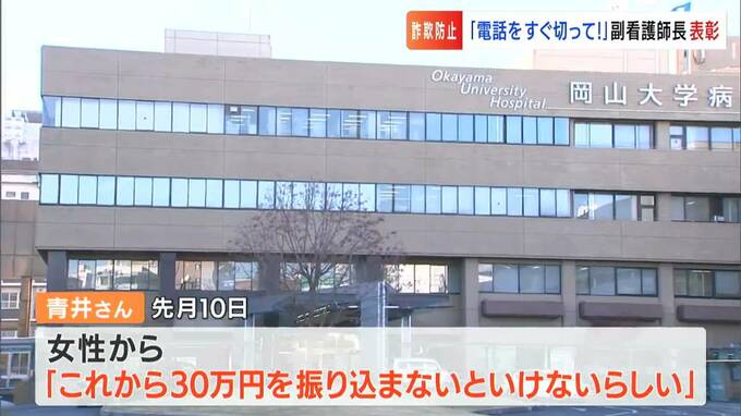 「電話をすぐ切って!」とっさの判断で、80代の女性患者の特殊詐欺被害を未然に防ぎました。岡山大学病院の副看護師長の女性に、警察から感謝状が贈られました。
