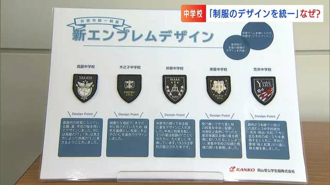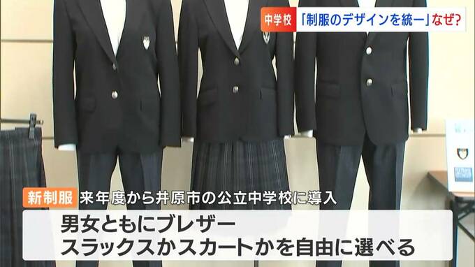 こちらが来年4月から井原市の公立中学校に導入される新たな制服です。これまで男子は詰襟、女子はセーラー服でしたが、性の多様性に配慮し、トップスは男女ともにブレザー、ボトムスはスラックスかスカートかを自由に選べるようになっています。生徒や保護者からの要望を聞いた上でこのデザインが決まったそうですが、導入する5つの中学校ですべてデザインが統一されています。その理由とは…