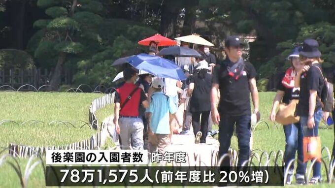 岡山県は、昨年度の後楽園の入園者数が、前年度を20%上回る78万1575人だったと発表しました。この内、外国人の入園者数は過去最多の15万3015人でした。新型コロナの5類移行や岡山空港の国際定期線の再開などが要因とみられています。