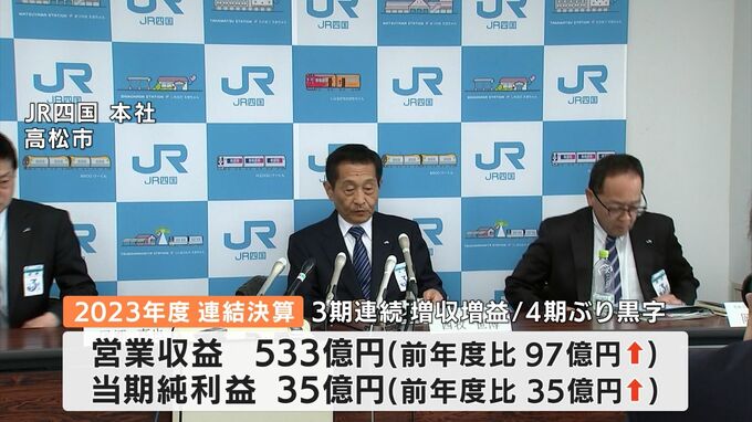 JR四国の昨年度の連結決算は、売り上げに当たる営業収益が533億円と、前の年度より大幅に増えました。資源価格の高騰など不透明な経営環境が続く中当期純利益を35億円確保し、4期ぶりの黒字です。