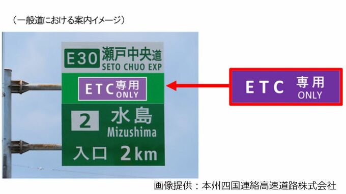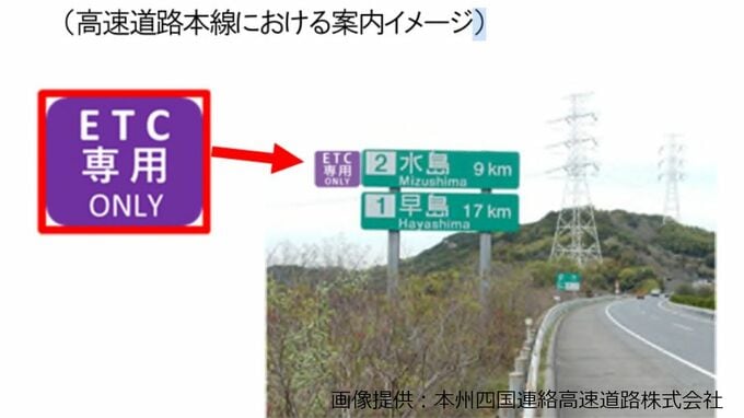 運用開始に合わせ、インターチェンジ付近の高速道路本線及び一般道の案内標識に、ETC専用の標示板を設置し、ETC車専用であることをわかりやすく表示する予定です。