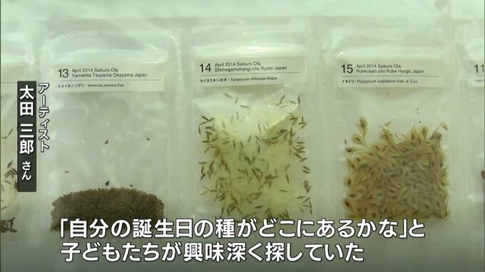 壁一面に並ぶのは太田さんが毎日欠かさず集め続けた植物の種10年分をカレンダーのように配置した作品です。