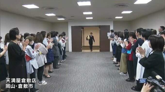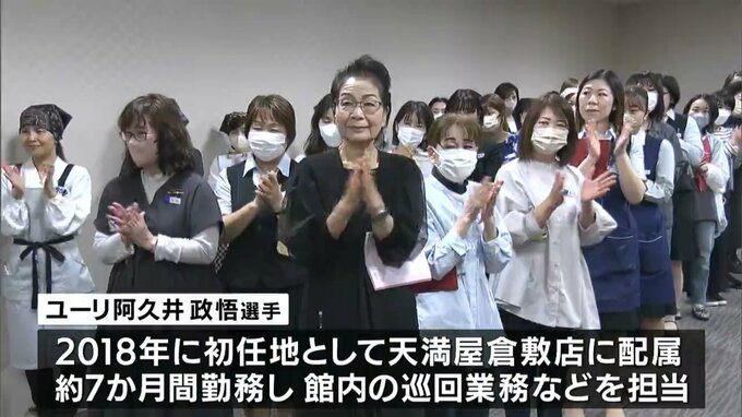 ユーリ阿久井政悟選手はボクサーとして世界と戦う傍ら、普段は警備会社に所属しています。きょう(13日)は2018年に勤務先の初任地として配属された天満屋倉敷店に凱旋しました。今月(5月)6日、東京ドームで行われた世界タイトル戦で初防衛を果たしたユーリ選手は、かつての同僚らにその喜びを報告しました。