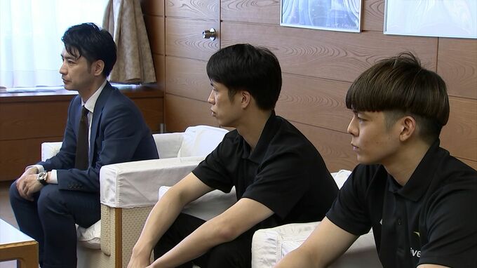 高松市役所を訪れたのは香川ファイブアローズの生岡社長、籔内ヘッドコーチ、上良キャプテンの3人です。ファイブアローズは、レギュラーシーズンを2位で終え、B2への返り咲きが期待されましたが、プレーオフセミファイナルで敗退し、惜しくもB3残留となりました。