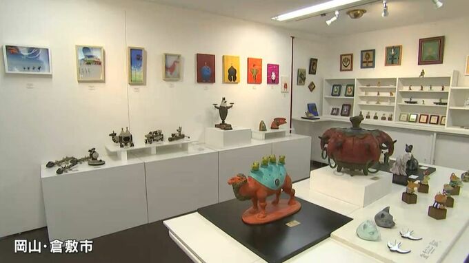 倉敷市のギャラリーで開かれている展覧会「ゆかいなどうぶつ展」には、岡山県に住む8人のアーティストによる絵画や陶芸などの作品約150点が並びます。
