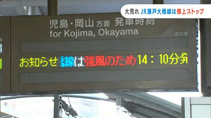 JRでは、岡山と高知、愛媛、徳島を結ぶ列車で、瀬戸大橋を通る区間の運転が一時ストップ。快速マリンライナーでは一部の列車が、岡山から児島の間、高松から宇多津の間での運転となりました。午後2時すぎ、安全の確認が出来たため瀬戸大橋を通る全ての列車の運転が再開されたということです。