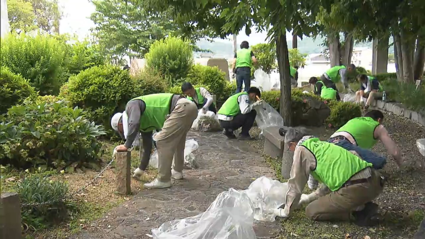 参加者は旭川荘の利用者に気持ちよく施設を使ってもらおうと、早朝から草を刈るなどしてすがすがしい汗を流していました。