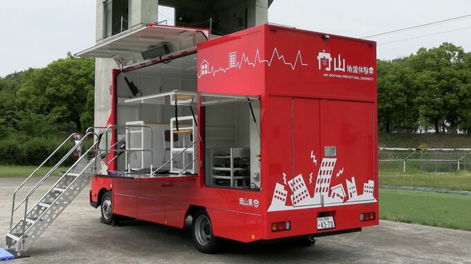 防災イベントなどで使われる岡山県の地震体験車が来月(6月)から更新されることになり、新しい車両が公開されました。