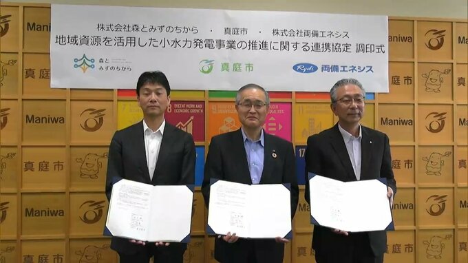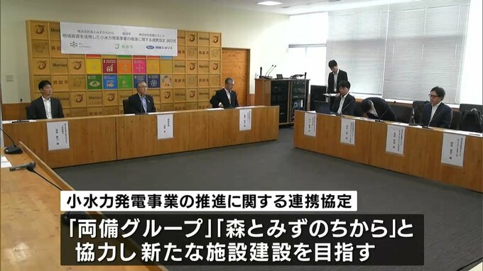 きのう(23日)真庭市で行われた連携協定の調印式です。現在2つの小水力発電所を所有している真庭市ですが、専門的なノウハウを持つ2社、「両備グループ」と奈良にある会社「森とみずのちから」が力を合わせることで、さらなる施設の建設を目指すといいます。