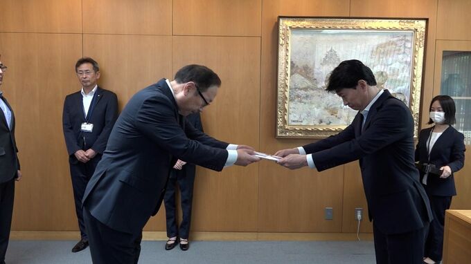 きょう(29日)、岡山県遊技業協同組合の千原理事長らが岡山県庁を訪れ、伊原木知事に100万円の義援金を手渡しました。義援金は組合に加盟するパチンコ・パチスロ店97店舗に設置した募金箱などで集められたものです。浄財は日本赤十字社を通じて能登半島地震の被災地に送られます。