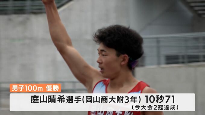 一方、男子100メートル決勝には岡山県高校記録を持つ岡山商大附属の庭山晴希選手が登場。スタートでは第7レーン・玉野光南の上山拓己選手に先行されたものの、意地の追い上げで最後は振り切り、きのうの400メートルに続き2冠を達成しました。