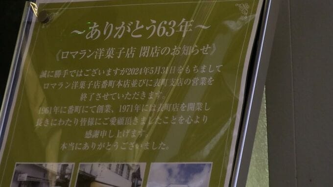 きょう(31日)閉店したのは、岡山市北区にある「ロマラン洋菓子店」の「番町本店」と「表町支店」です。1961年に番町本店が開店し、その10年後には表町の店が開店、これまで63年間岡山の人々に親しまれてきたお店です。