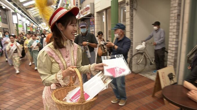 パレードの途中では、RSKアナウンサーから買い物客らにオランダ風車にちなんだ風車のキットやグラジオラスなどの球根セットが配られました。表町商店街はにぎやかなパレードで華やかなムードに包まれました。