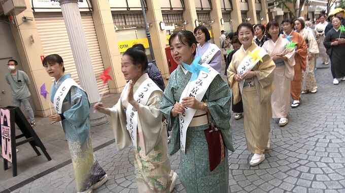 パレードには、きのうが誕生日のおイネに扮する岡田美奈子アナウンサーを先頭にむつみ京都きもの学院などからおよそ50人が参加しました。