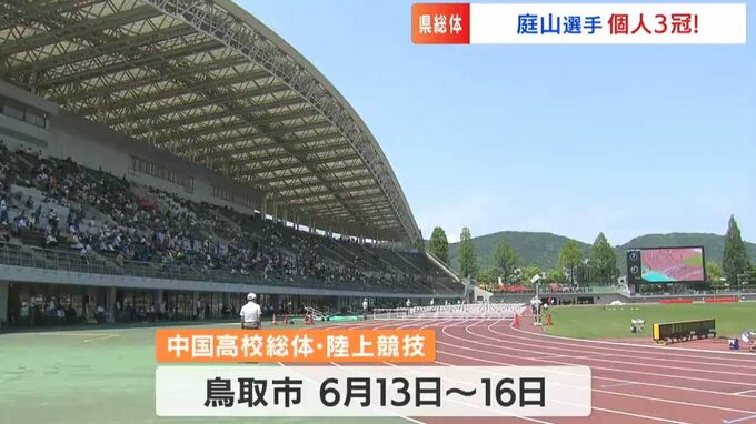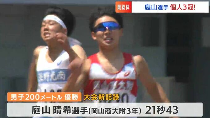 また、男子200メートルに出場した庭山晴希選手は、大会新記録で優勝。100メートル、400メートルに続き3冠を達成し、リレーと合わせて中国高校総体4種目での出場を決めました。