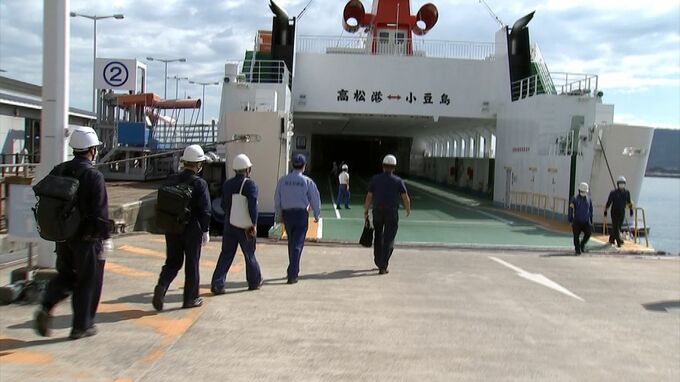 午前8時半、高松-土庄航路のフェリー「第一しょうどしま丸」に四国運輸局と高松海上保安部の職員9人が乗りこみました。万一の場合に必要となる救命胴衣や消火器に劣化がないかや点検記録簿を見て運航中止基準が守られているかなどを確認しました。