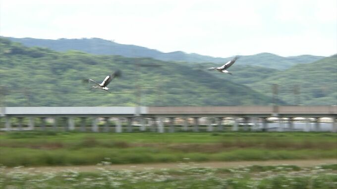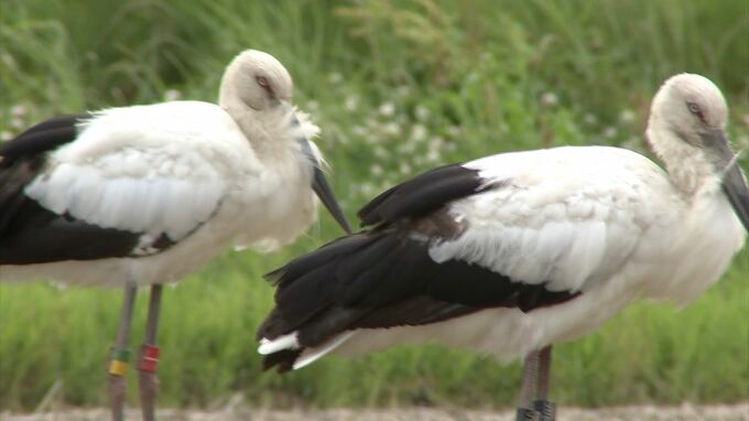 岡山市東区の休耕田にいたのは「幸せを運ぶ」とも言われるコウノトリ。大型の水鳥で、まっすぐに長くのびた黒いくちばしが特徴です。絶滅危惧種に指定されていて、日本にはわずか362羽が生息しています。足環から野外でふ化した1歳と4歳のオスのコウノトリと分かりました。この地区では、10年ほど前から、コウノトリが訪れるようになったと言います。