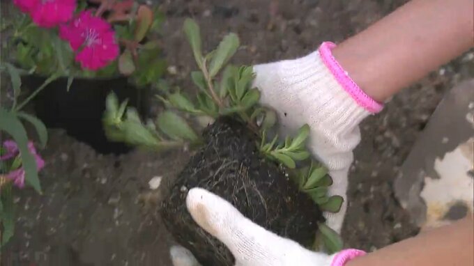 今回贈られたのは、可憐な花を咲かせる日日草とポーチュラカ。子どもたちはタイムの職員から植え方について説明を受けた後、職員らといっしょに慣れない手つきで苗を植えていきました。