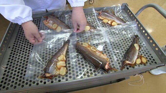 刺身にするには身が少ないため、骨まで丸ごと食べられる製品づくりに取り組みました。下処理をしたあと一度、オーブンで加熱。そして、タレと一緒に真空パックに詰め、骨が柔らかくなるまで、さらに加熱殺菌します。こうすることで、常温で長期保存もできるメリットも生まれます。