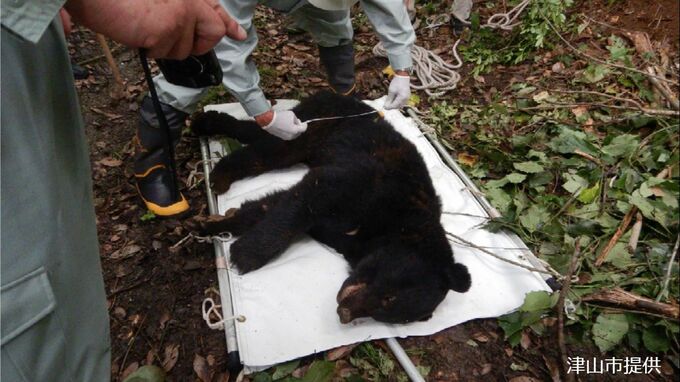 ツキノワグマはもともとのツキノワグマの生息地で誤ってイノシシ・シカ用の罠に捕獲されたため、岡山県の管理計画に基づき、麻酔銃で眠らせた後、集落のない奥山に放獣されるということです。