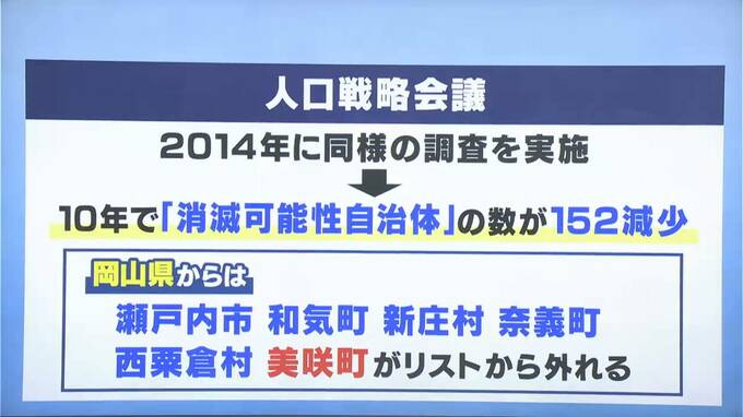 これに先立ち、今年4月には有識者グループ「人口戦略会議」が、2020年から2050年までの30年間で若い女性が50%以上減少するとされる「消滅可能性自治体」を発表しました。自治体の4割、岡山で10、香川で4つの自治体が該当しています。同様の調査は2014年にも行われていて、実はその総数は意外にも10年で152も減っているんです。