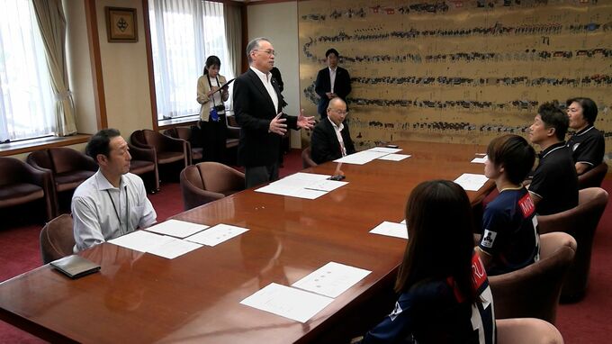 女子サッカーなでしこリーグ2部の岡山湯郷ベルが6月末、岡山県津山市で開催されるホームゲームをPRするため津山市役所を訪れました。
