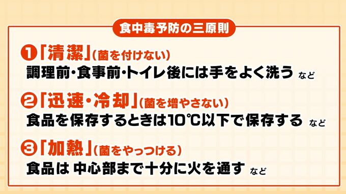 県は、調理・食事の前には手を洗うことや食品は10℃以下で保存し十分火を通すことなど「食中毒予防の三原則」を呼びかけています。