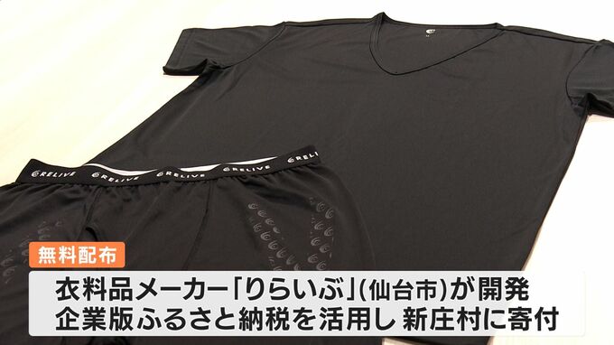 宮城県仙台市の衣料品メーカーが開発し、企業版ふるさと納税を活用して新庄村に商品を寄付。トルマリンとテラヘルツの鉱石を練りこんだインクをプリントし、遠赤外線が放出され血行促進などの効果が期待できるといいます。