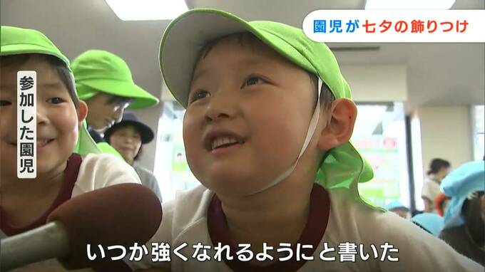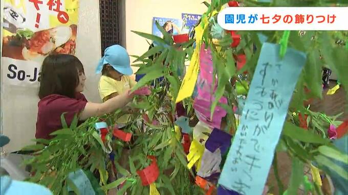 もうすぐ七夕です。総社市の幼稚園児が家族と一緒に願いを書いた短冊の飾りつけをしました。