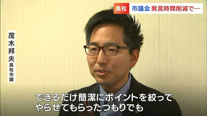 高松市の6月議会では、議事運営の円滑化のため、これまで一律50分だった各会派の代表質問を所属する人数に応じて30分~60分とし、2人以下の会派と無所属議員の質疑は15分に削減しました。