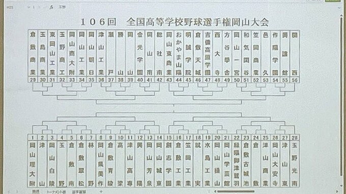 強豪・岡山理大附は、2回戦で津山・岡山白陵の勝者と。昨年秋の県大会で準優勝の岡山城東は、2回戦で興陽・岡山芳泉の勝者と対戦します。