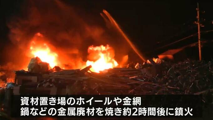 昨夜、午後8時40分頃津山市院庄にあるリサイクル業者の資材置き場から火が出ていると、付近を歩いていた女性(45)が気付き119番しました。消防などが駆け付けて消火にあたりましたが、資材置き場にあったホイールや金網、鍋などの金属廃材が燃え、約2時間後に鎮火しました。警察によりますと、出火当時、リサイクル業者の社員らは退社しており、無人で、けが人はいませんでした。