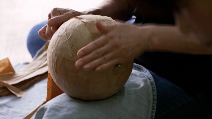 職人たちは、花火玉を糊のついたクラフト紙でひとつひとつ丁寧に巻いたあと、天日で乾燥させるため慎重に外の棚へと移していました。