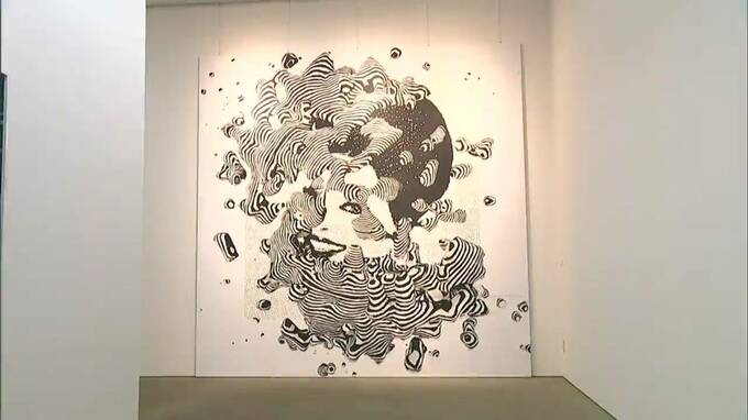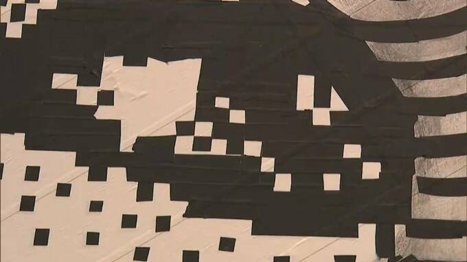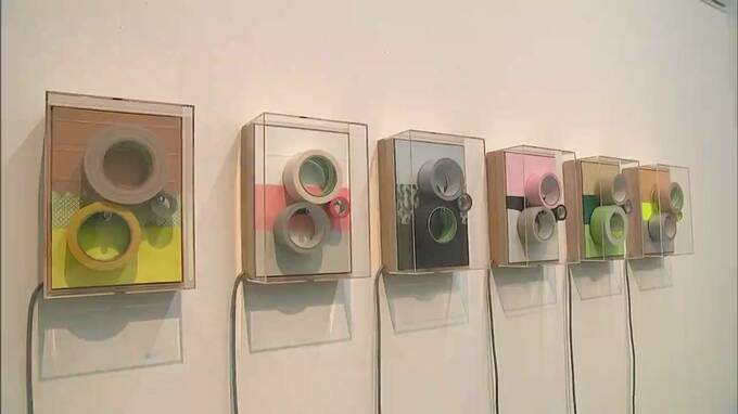モノクロで描かれた女性の肖像画に、電気仕掛けのアート作品。全てマスキングテープで作られています。