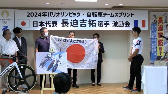 笠岡市のホテルで開かれた激励会には、地元の「応援する会」のメンバーら約50人が出席しました。長迫吉拓選手は自転車のBMXでリオ、東京と五輪に出場。その後トラック競技に転向しパリではチームスプリントに出場します。ステージでは母校の中学校から寄せ書きの入った国旗が贈られ、改めて意気込みを語りました。